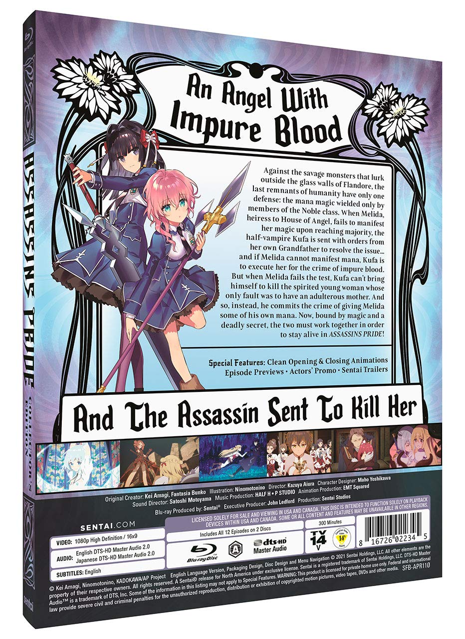 Against the savage monsters that lurk outside the glass walls of Flandore, the last remnants of humanity have only one defense: the mana magic wielded only by members of the Noble class. When Melida, heiress to House of Angel, fails to manifest her magic upon reaching majority, the half-vampire Kufa is sent with orders from her own Grandfather to resolve the issue... and if Melida cannot manifest mana, Kufa is to execute her for the crime of impure blood. But when Melida fails the test, Kufa can't bring himself to kill the spirited young woman whose only fault was to have an adulterous mother. And so, instead, he commits the crime of giving Melida some of his own mana. Now, bound by magic and a deadly secret, the two must work together in order to stay alive in Assassins Pride!