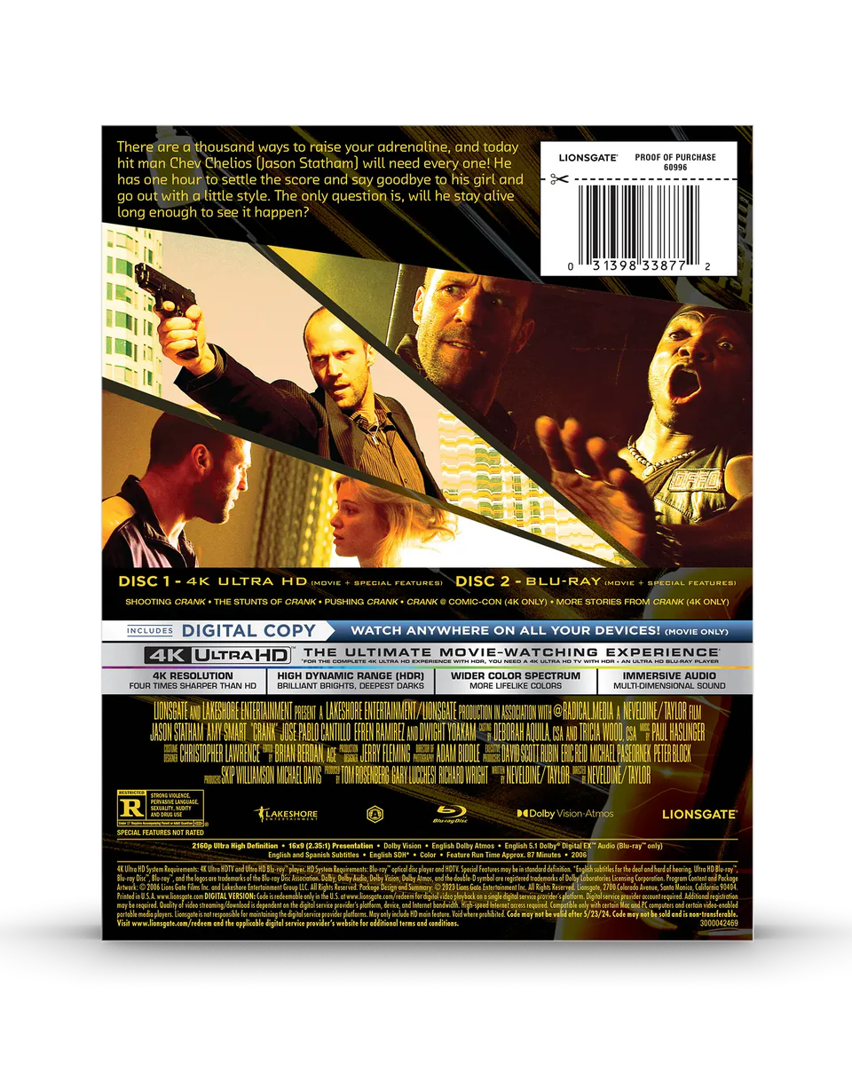 Explosive, relentless, and built like a shot of pure energy, Crank is the ultimate high-octane action ride—now in a Limited Edition Steelbook loaded with special features and presented in 4K with Dolby Vision for a sharper, more intense home viewing experience.