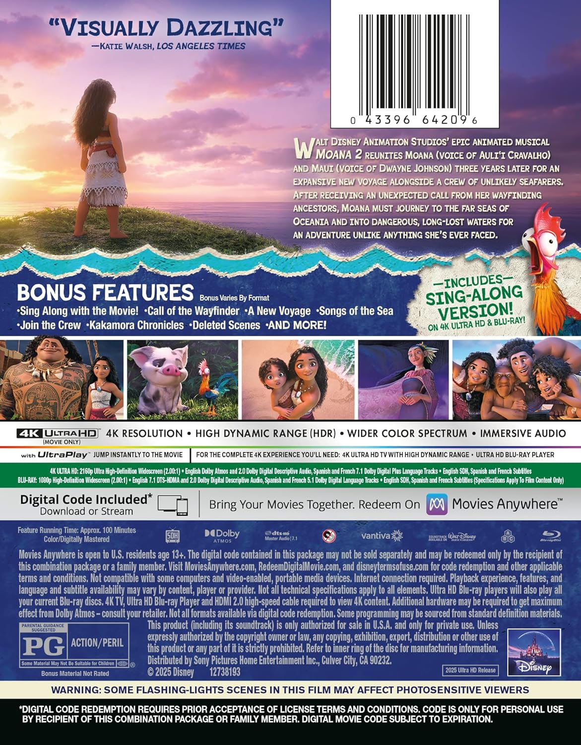 Walt Disney Animation Studios’ animated musical reunites Moana and Maui three years later for an expansive new voyage alongside a crew of unlikely seafarers. After hearing from her wayfinding ancestors, Moana must journey into long-lost waters for an adventure. Warning: Some flashing-lights scenes in this film may affect photosensitive viewers.