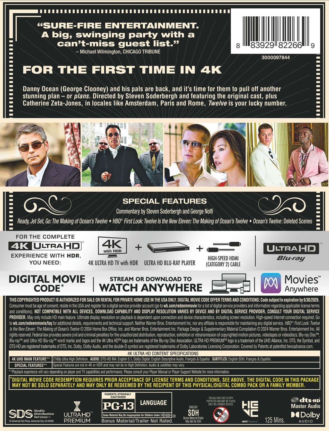 Danny Ocean (George Clooney) and his pals are back, and it’s time for them to pull off another stunning plan – or plans. Directed by Steven Soderbergh and featuring the original cast, plus Catherine Zeta-Jones, in locales like Amsterdam, Paris and Rome, Twelve is your lucky number.