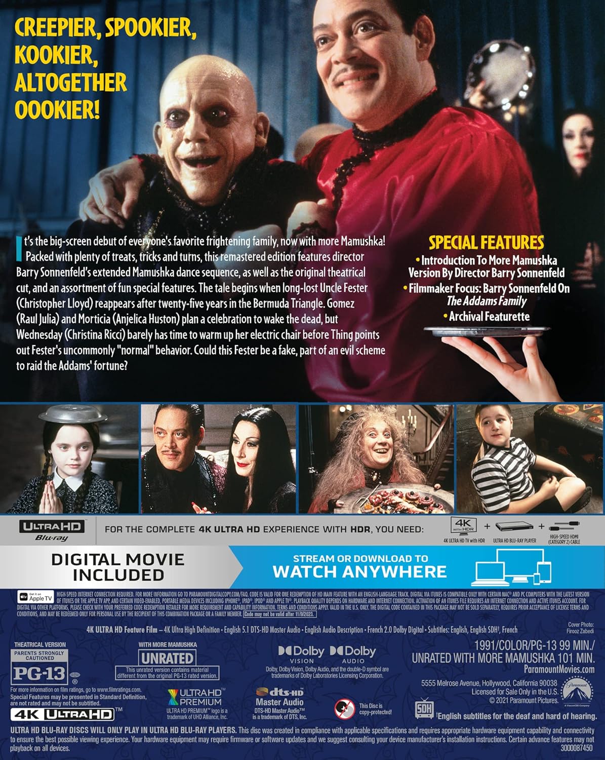 The ghoulish clan made famous in Charles Addams' cartoons and the '60s TV show make their big-screen debut in this horrifically funny hit comedy. Has long-lost Uncle Fester come back after 20 years in the Bermuda Triangle, or is the bald stranger at the Addams door an impostor? Raul Julia, Anjelica Huston, Christopher Lloyd, Christina Ricci, Dan Hedaya, and "Thing" star; directed by Barry Sonnenfeld. PG-13-rated version; 99 min./Unrated extended cut; 101 min. Widescreen; Soundtracks: English DTS HD 5.1 Master Audio, French Dolby Digital stereo; Subtitles: English (SDH), French; featurettes.